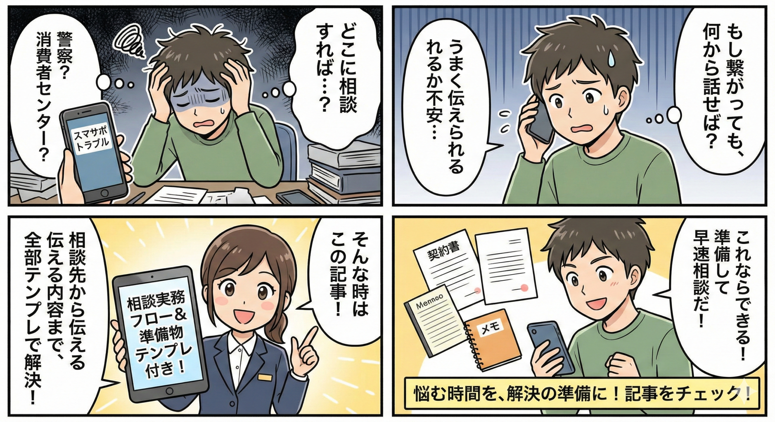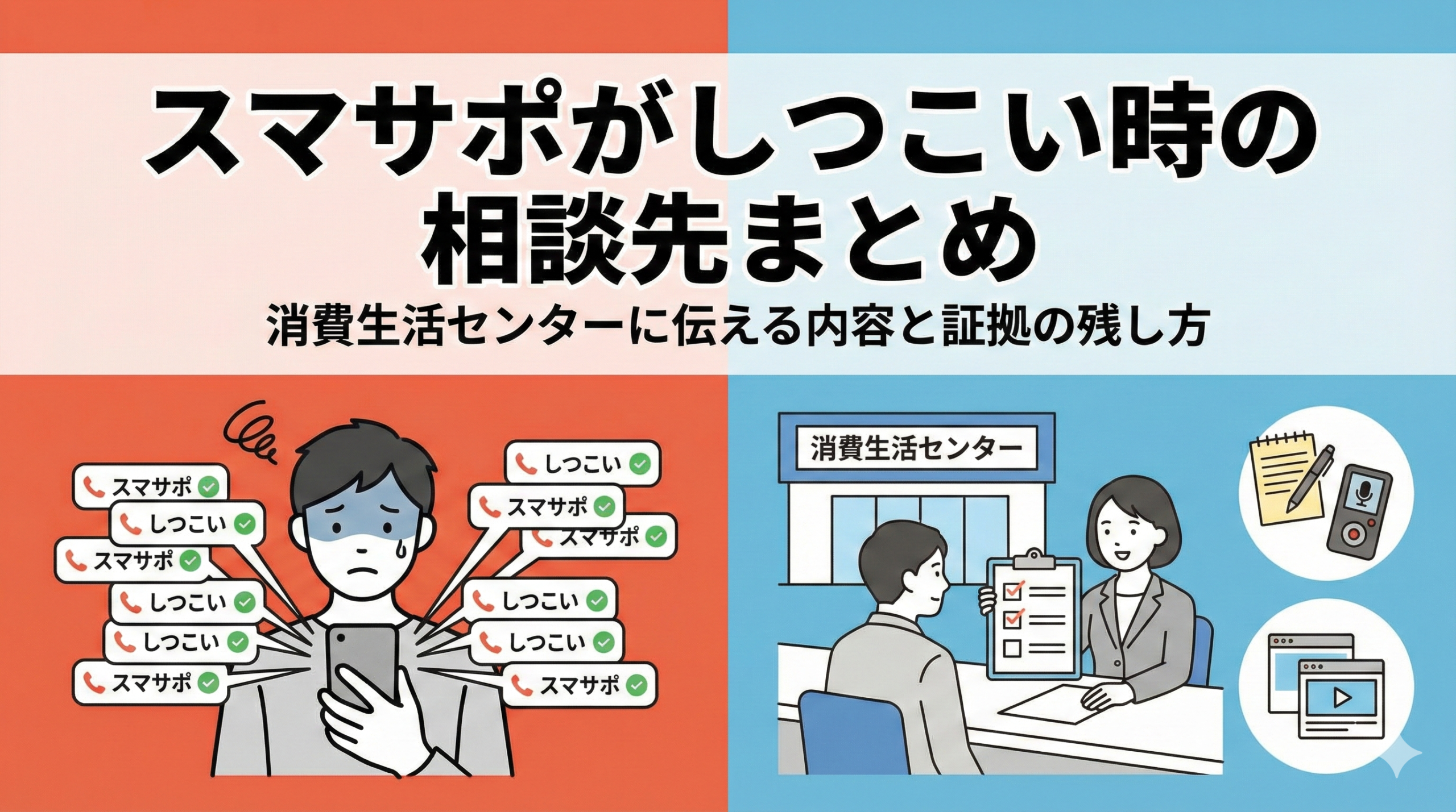 「どこに相談すればいいかわからない」「相談しても何を伝えるべきか不安」——この2つが、対応を遅らせる最大の原因です。この記事では、スマサポ関連トラブルを相談するための実務フローを、準備物テンプレ付きで解説します。